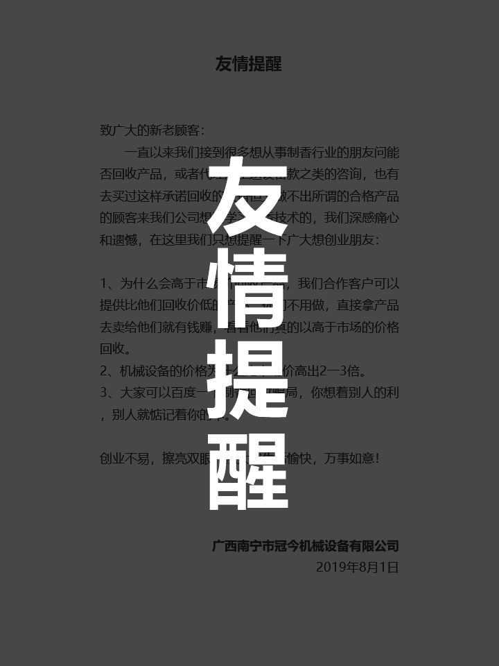 廣西南寧市冠今機(jī)械設(shè)備有限公司(原南寧市富利機(jī)械加工廠)是一家集制香機(jī)械設(shè)備開發(fā)設(shè)計、香品生產(chǎn)銷售于一體的科技企業(yè),引進(jìn)國際先進(jìn)技術(shù)所研究出來的制香機(jī)設(shè)備是可生產(chǎn)多種類型的衛(wèi)生香,檀香,竹簽香等。擁有大型香業(yè)基地及堅實的硬件基礎(chǔ),在制香機(jī)械領(lǐng)域具有從研發(fā)到批量生產(chǎn)的全方位優(yōu)勢。